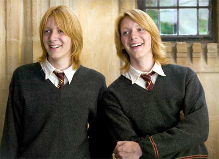 Os gêmeos Fred Weasley (James Phelps) e Jorge Weasley (Oliver Phelps) Divulgação