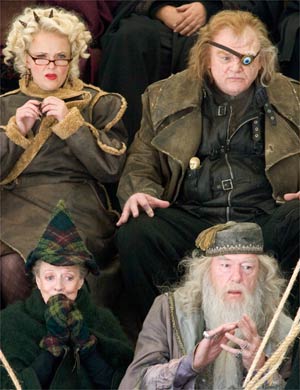 A jornalista manipuladora Rita Skeeter, Olho-Tonto Moody, Minerva e Dumbledore